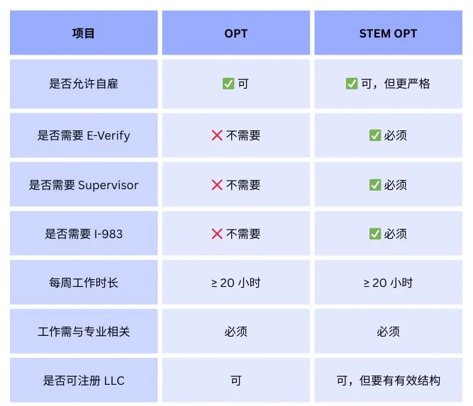 🟦 五、OPT vs STEM OPT 自雇区别(简明对比表)